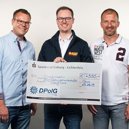 Die Rettungshundestaffel des ASB Kreisverband Coburg Land e.V. bekommt auf Ihrem Weg zum eigenen Einsatzfahrzeug Unterstützung von der Deutschen Polizeigewerkschaft (DPolG) Kreisverband Coburg. „Wir konnten nach mittlerweile 15 durchgeführten Veranstaltungen je-weils ca. 500 Euro an Spenden weiter reichen.“, berichtet Tino Wetzig von der DPolG in Coburg.
