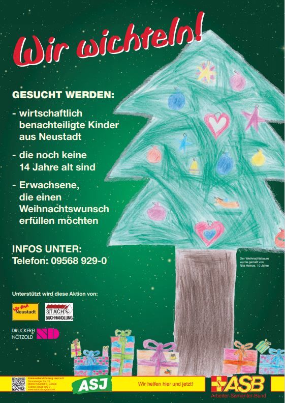 Für viele Kinder ist es ganz natürlich, Geschenke zu Weihnachten zu erhalten. Doch für so manche sieht die Realität leider anders aus. Auch im Raum Neustadt stoßen viele Familien beim Besorgen der Weihnachtsgeschenke an ihre finanziellen Grenzen. Der ASB möchte mit seiner Wichtelbaum-Aktion Kindern ein Lächeln ins Gesicht zaubern, die sonst eher auf der Schattenseite stehen. „Weihnachten ist das Fest der Emotionen. Wir suchen auch in diesem Jahr wieder Menschen, die auch die benachteiligten Menschen der Gesellschaft im Blick haben und Wünsche von Kindern erfüllen und Weihnachtsgeschenke packen“, so Rainer Schreier, Geschäftsführer des ASB KV Coburger Land e.V.